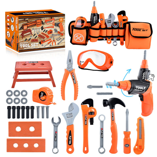 Casrra 33PCS Orange Kids Tool Kit Set & Child Size Tool Belt. Real Kit for DIY Building, Woodwork & Construction Learning for Kids