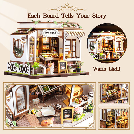 Casrra 3D Wooden Puzzle Mini Pet Shop DIY Miniature House Kit – Tiny Home with Furniture, STEM Craft for Adults & Kids 14+